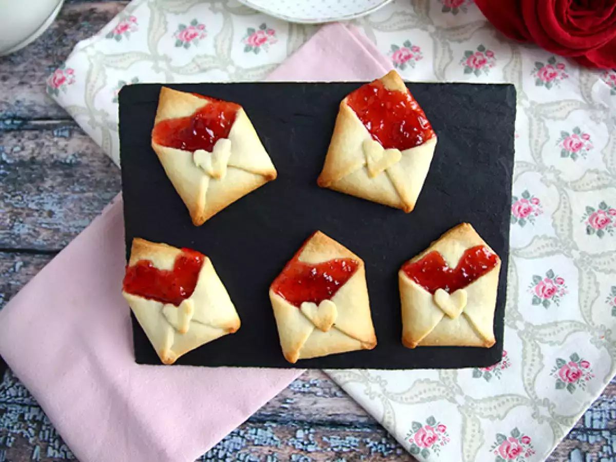 Bagaimana jika Anda menulis surat cinta yang indah untuk pasangan Anda di Hari Valentine? Tidak terinspirasi? Baiklah, kami akan menyimpan ide surat itu, tapi surat itu akan bisa dimakan! Surat itu diubah menjadi selai, yang bisa dimasukkan ke dalam roti pendek berbentuk amplop, disegel dengan hati yang cantik. Lumayan, bukan? Lebih mudah dibuat daripada menulis surat dan dijamin akan terlihat bagus ;-) Terlebih lagi, Anda hanya membutuhkan 2 bahan saja! Luar biasa ;-) Ikuti petunjuk langkah demi langkah tentang cara membuat kudapan manis ini dan cara melipatnya untuk mendapatkan hasil yang indah ini.