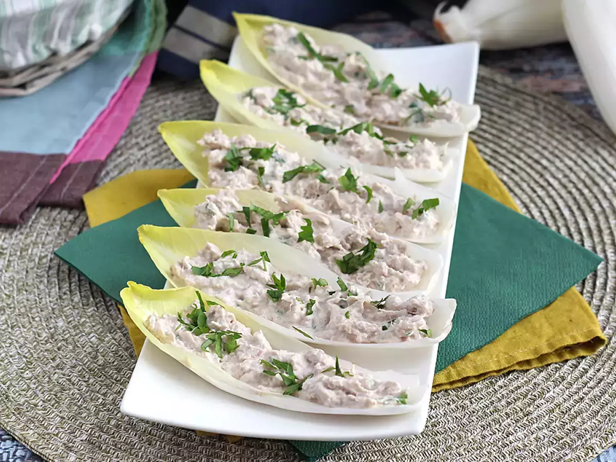 Untuk minuman beralkohol yang tidak perlu dimasak, cobalah nampan endive ini! Untuk isiannya, campurkan tuna, peterseli, peterseli, dan... itu saja! Kami sudah bilang, ini sangat mudah dibuat ;-) Letakkan isian di atas daun endive untuk mendapatkan efek segar.